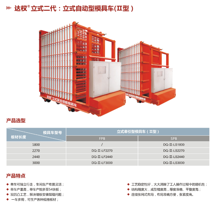 達(dá)權(quán)復(fù)合夾芯板立式模具車是達(dá)權(quán)首創(chuàng)的立式模具車,用于生產(chǎn)輕質(zhì)復(fù)合夾芯板,改變了傳統(tǒng)的臥式模具車生產(chǎn)形式,相對(duì)于傳統(tǒng)復(fù)合夾芯板臥式車,立式模具車更利于倒模拆模,大大提高了生產(chǎn)效率,降低了人工成本。性能已達(dá)到國(guó)際同類產(chǎn)品的領(lǐng)先水平。免費(fèi)提供本公司品牌、商標(biāo)、工藝流程的技術(shù)培訓(xùn),為建廠公司(合作廠家)全方位提供生產(chǎn)、安裝、銷售的扶持及服務(wù)。